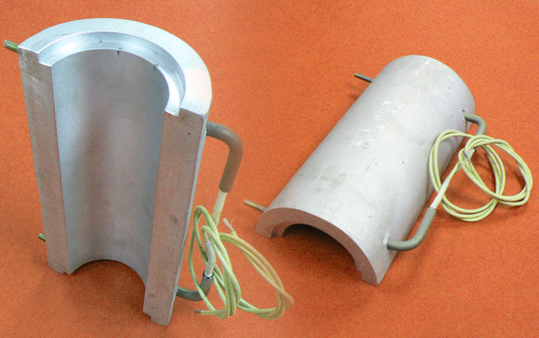 Cast-in liquid cooled barrel heaters are the most common cast -in heater design. The liquid cooling tubes run symmetrical to the heater element, which provides a uniform cooling pattern across the body of the casting. This cooling function dissipates heat rapidly from the cast-in barrel. To maintain lower watt densities important for good heater life, the largest possible diameter steel sheath tubular heater is used. Cooling tube extensions can be cut to your specified length. Many options available, liquid or air cooled.